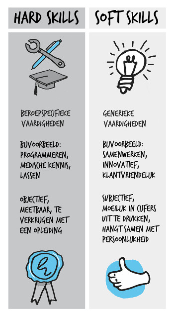 Soft en hard skills samen vormen de vaardigheden die je nodig hebt om een bepaald beroep uit te oefenen. Sommige vaardigheden zijn vak- of beroepspecifiek. Zoals een groot rijbewijs voor een vrachtwagenchauffeur, kunnen programmeren voor een software developer of medische kennis voor een huisarts. Dit zijn de hard skills. Deze vaardigheden zijn vaak essentieel, verkrijg je meestal na het volgen van een opleiding en zijn vaak in cijfers uit te drukken. Ga voor meer informatie naar het overzicht met 10 veelgevraagde hard skills. Soft skills zijn de niet beroepspecifieke vaardigheden die in veel verschillende functies gewenst zijn. Het worden ook wel zachte vaardigheden of generieke competenties genoemd. Denk hierbij aan vaardigheden als klantvriendelijkheid, kunnen samenwerken en innovatief denken. Soft skills zijn minder tastbaar en hangen vaak sterk samen met jouw persoonlijkheid.
