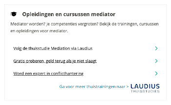Bij elk beroep op Jobpersonality kan je trainingen tonen waarmee je een relevant diploma haalt of vaardigheden leert die nodig zijn voor dit beroep. Je kan maximaal 3 tot 5 links per beroep kwijt plus een algemene hyperlink. Je vermelding is bovendien exclusief. In het blok met trainingen worden geen andere aanbieders getoond. Zie onderstaande voorbeeld bij het beroep van mediator met links naar Laudius.nl.